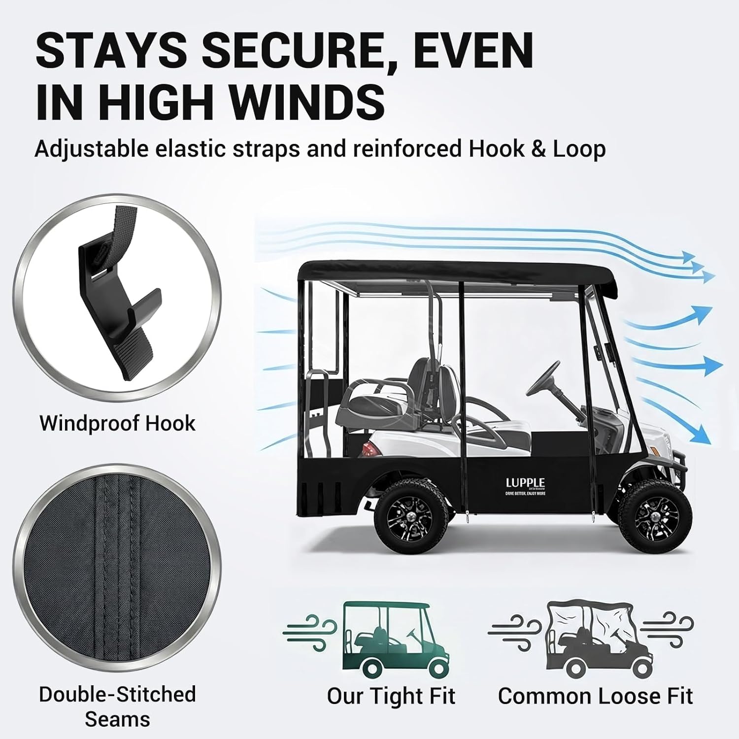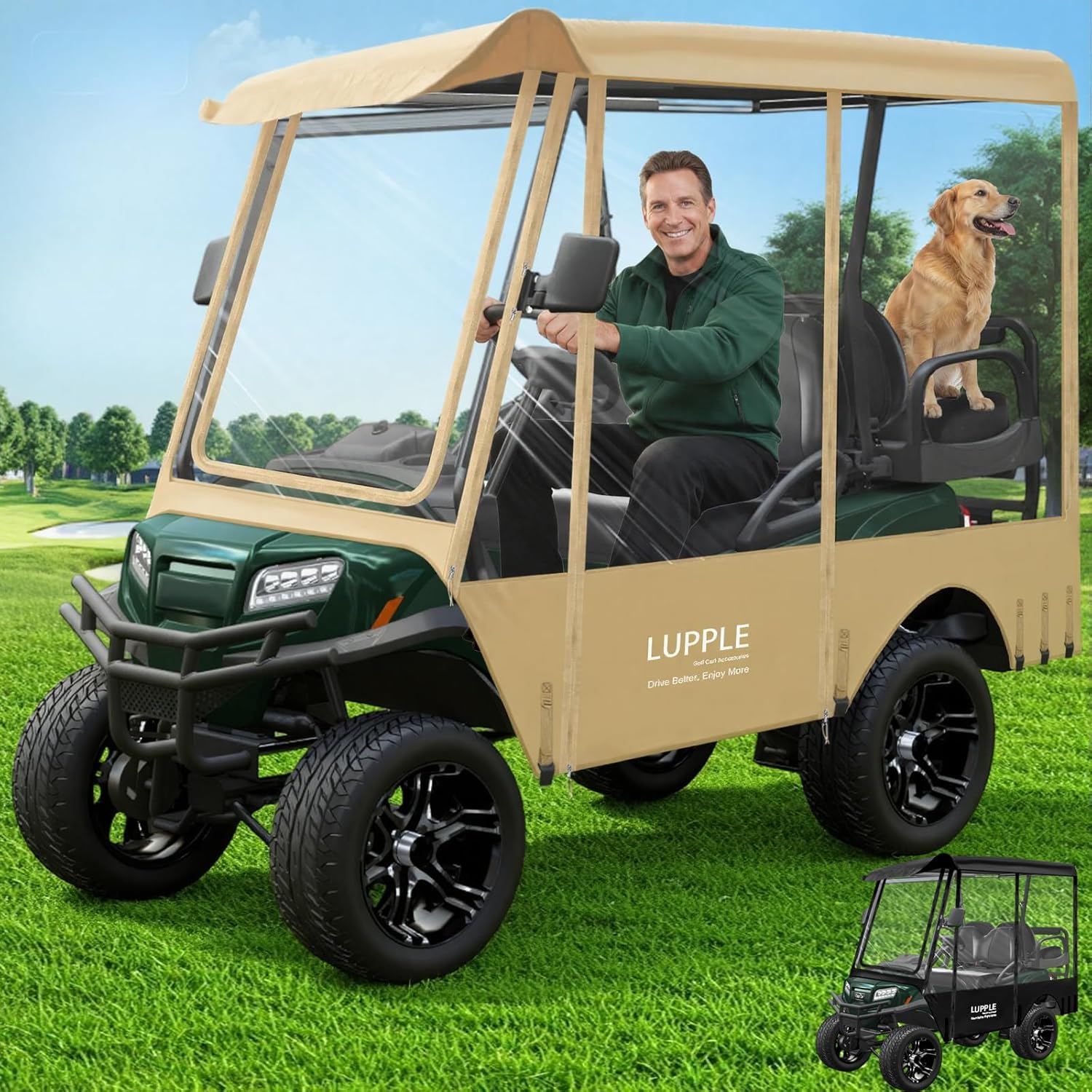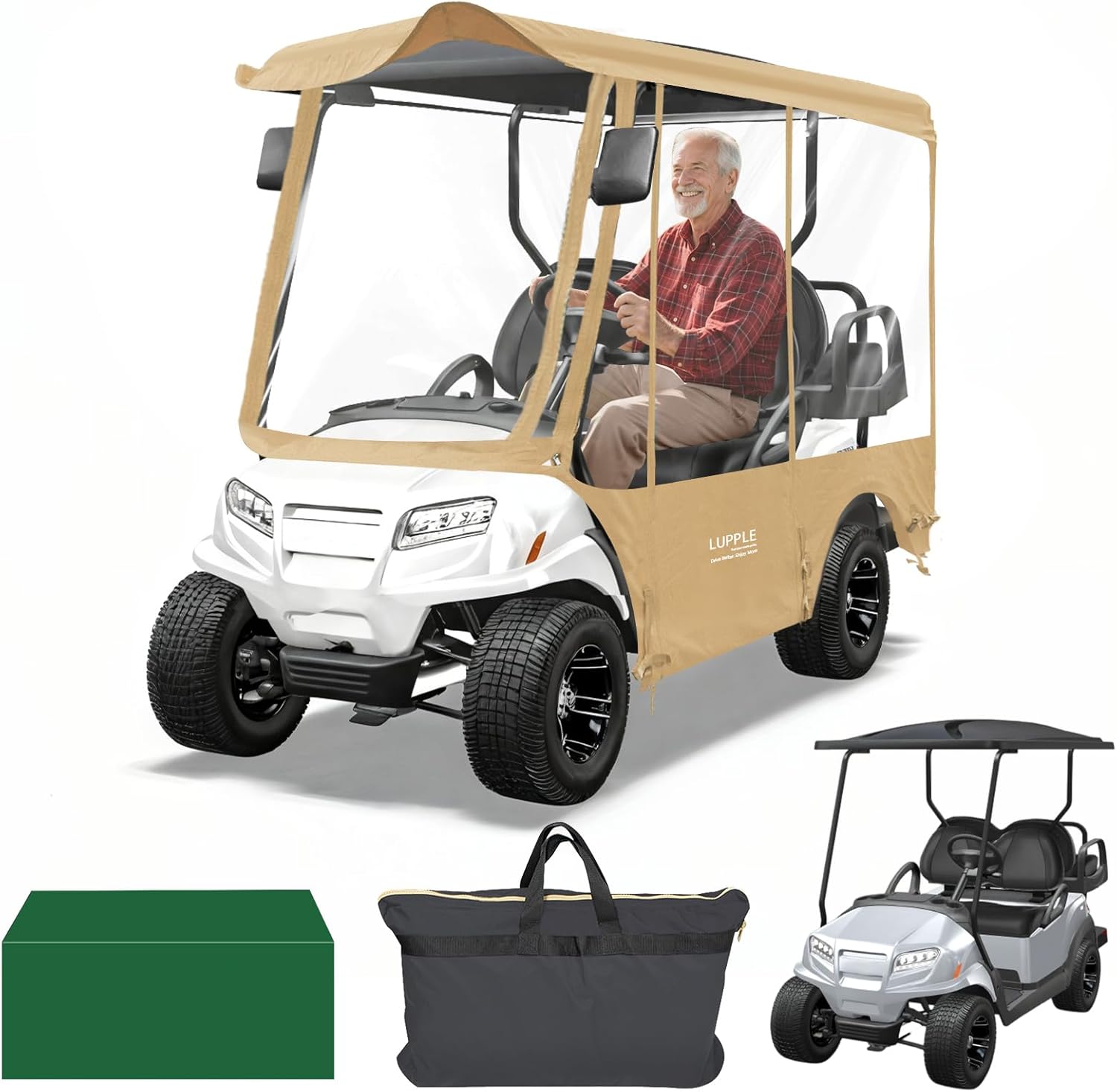 STOP LETTING WEATHER STEAL YOUR OUTDOOR PLAN Picture this: It’s 45°F and drizzling, but YOU’re cruising the fairway in total comfort – warm, dry, and grinning as others flee to the clubhouse. The LUPPLE 4-Seat Golf Cart Enclosure turns your ride into an all-season command center! WHY 2,300+ GOLF CART OWNERS UPGRADED TO LUPPLE: "FINALLY – A COVER THAT DOESN’T SUCK!" Our 600D oxford/PVC combo blocks 100% of rain and wind while resisting tears from clubs/trees. The thickened 0.37mm windows (3X thicker than cheap covers) stay crystal clear for years without yellowing. STAYS PUT WHEN OTHERS FLY AWAY 10 wind hooks anchor your cover during 50mph winds. No more chasing flapping fabric across the parking lot! NIGHT DRIVING? NO SWEAT Double reflective stripes make you visible to cars, while the transparent tail panel keeps brake lights fully functional for street-legal safety. BONUS: THE ULTIMATE GOLF DAD GIFT Zip-open doors, roll-up windows, and no tools needed. Store it in the included bag—lighter and tougher than bulky competitors. Watch their jaw drop when they realize they can golf comfortably in ANY weather! WARNING: This cover fits 86" extended roofs ONLY (measure your cart!). Fits most 4-seat Yamaha, EZGO TXT/RXV, Club Car DS/Precedent models.
