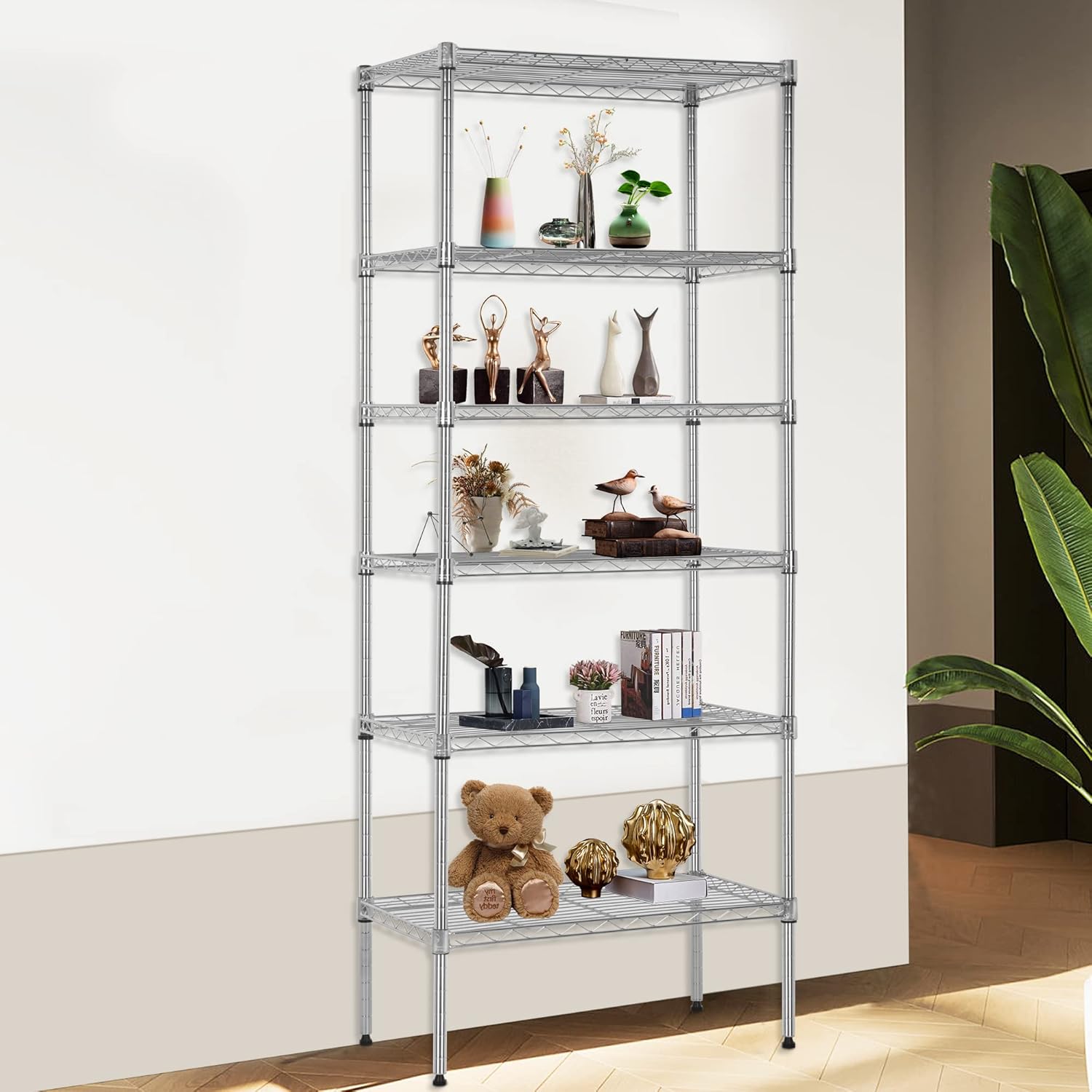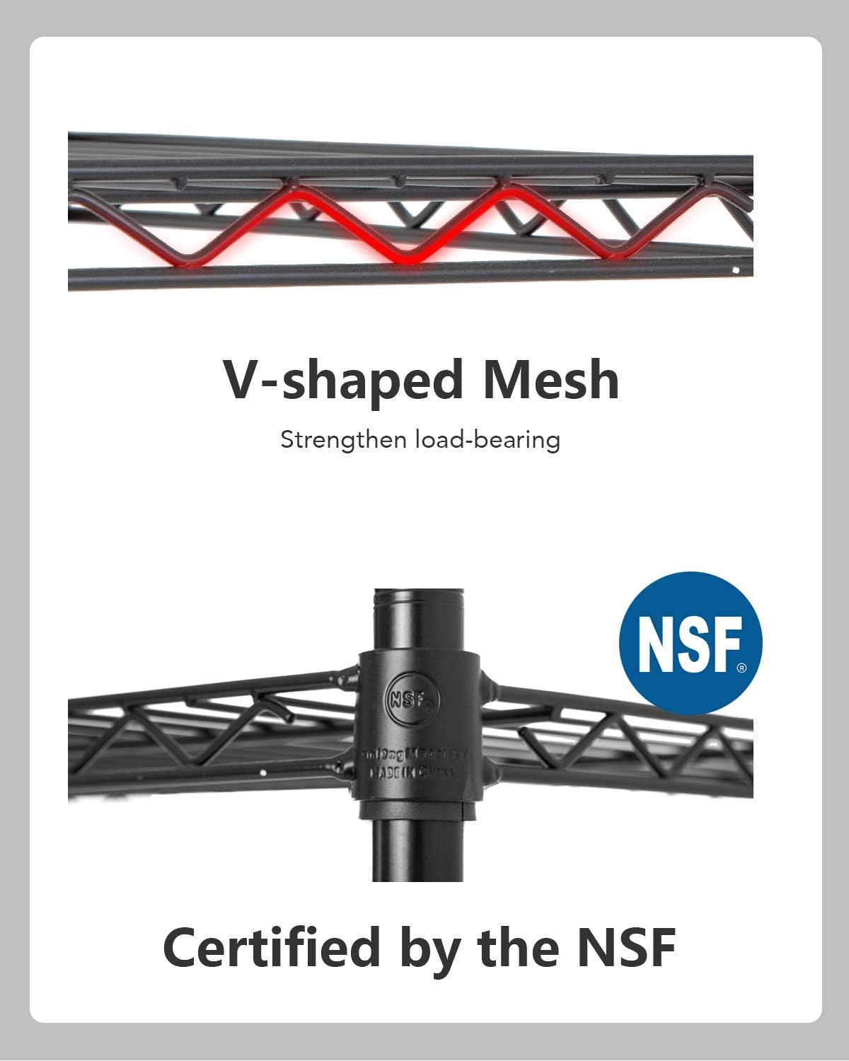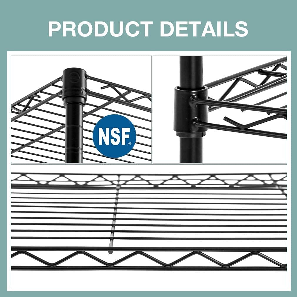 ☀Lot's of Storage Space: Size:5-Tier-1250 LBS Size: 36" W x 14" D x 72" H Capacity: 250 lbs (Per layer with feet levelers) Total 1250lbs; ☀WARNING: HOKING HAZARD -- Small parts. Not for children under 3 yrs. ☀Commercial Adjustable Shelves: ☺【garage / sheds / basement / industrial warehouse】:Our versatile shelving is perfect for keeping your heavy tools and equipment organised. Storage shelf’s layer can be set at any height for your individual needs.Storage shelf’s layer can be set at any height for your individual needs. ☺【restaurant / kitchen / pantry】:Our NSF storage shelves meet sanitation requirements,they worked great as extra pantry shelving, tools, store cooking equipment, and ingredients.The adjustable shelves could fit different height of the items.Make this Wire Shelf Unit get the most out of it.. ☺【laundry room / open loft / storage room】:Our versatile shelving can minimise clutter throughout your home with our wide range of storage solutions. The steel wire shelving of the storage shelf is very durable, so it can hold a lot of things.
