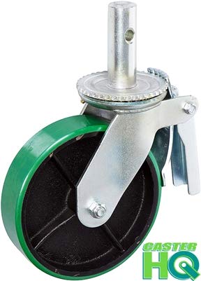 6" x 2" Scaffolding Caster Set of 4 with Total Lock Brakes - Green Poly on Steel Wheel Listing is for a Set of 4 CasterHQ 6 Inch Scaffolding Casters. Industry Standard 1-3/8" x 4" with 1/2" Cross-drilled hole - 2-1/2" up from base. These casters are Universal replacements for most Rolling Scaffolding units. All of CasterHQ's Scaffolding Casters come with Steel Thread Guards as a standard upgrade to extend the life of the wheel, bearings, and prevent dust and debris from interfering with the roller bearing. Each Caster is rated at 700 lbs capacity. Brakes are easy to engage and disengage, brakes are total locking which means the wheel and the swivel will both lock simultaneously when the brakes are engaged. Grease fitting included in Swivel Raceway and a Zerk axle is provided for easy access points to grease the wheels roller bearing. Finish is a bright zinc plating which helps prevent rust opposed to standard un-plated steel. Many painters use scaffolding equipment as well as theatrical motion picture equipment, and of course the construction industry. Scaffolding Casters allow you to change your stationary platform into a mobile platform with easy maneuverability. Features Diameter: 6" Width: 2" Color: Green Wheel Material: Polyurethane on Steel Stem: 1-3/8" x 4" with 1/2" Cross-drilled hole - 2-1/2" up from base Capacity: 700 lbs each caster
